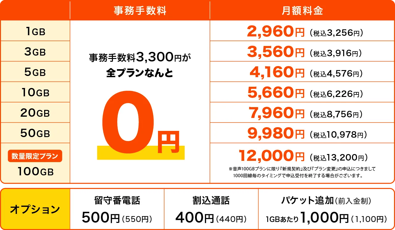 事務手数料3,300円と翌月のプラン代金、消費税、諸費用(ユニバーサル料、リレーサービス料)となります。