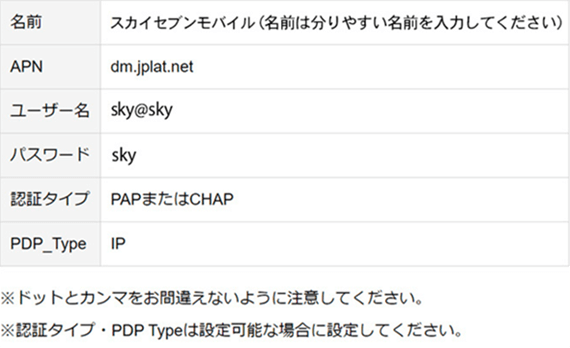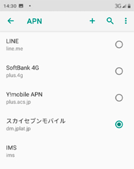 スカイセブンモバイルのAPNを選択(チェック)します。